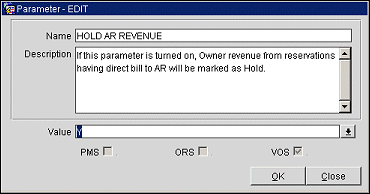 To activate the Hold AR parameter, select the Ownership group, and then select the Parameters radio button. Place your cursor on the Hold AR Revenue parameter, and select the Edit button. The Parameter - EDIT screen appears.