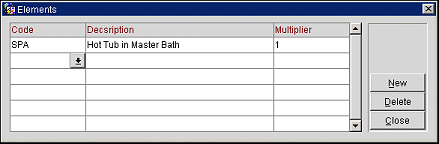 Select the element code from the list of values in the Code field, and then enter the multiplier in the Multiplier field (see also, Understanding the Points System). If necessary, select the New button to add additional unit elements, and repeat these steps for as many elements as the unit contains. You can select the Delete button to delete the unit element, or the Close button to close the Elements screen.