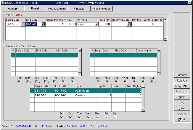 Once the Unit Elements have been defined and the other General Setups are complete, the unit elements can be added to a new or existing contract. This is done from the Rental tab of the Contract screen.