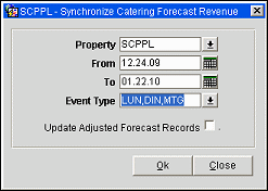 To run the Catering Forecast Revenue Synchronization utility, provide the following information and select the OK button.