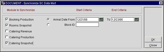 The Utilities>Synchronize Utilities>Synchronize SC Data Mart utility, allows the user to sync Booking Production, Rooms Snapshot and Catering revenue data between their respective tables. The Utility gives the option of synchronizing by Block ID or Arrival period.