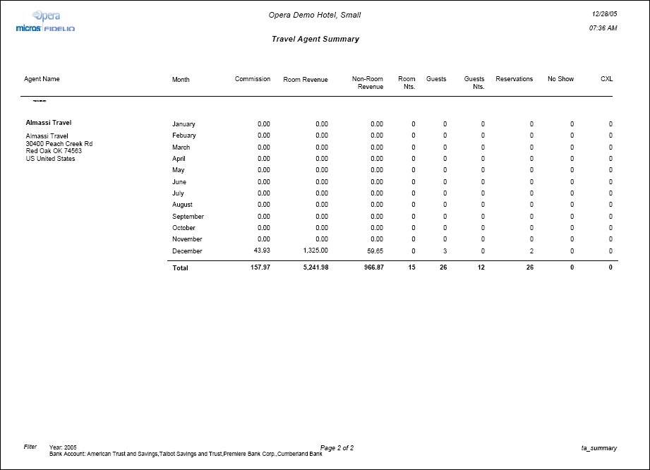 The Travel Agent Summary is a month-by-month digest of Commissions, Room Revenue, Non Room Revenue, Room Nights, number of Guests, Guest Nights, and No Show and Cancelled reservations for each Travel Agent. The data includes all reservations that have been placed in Commission Processing because a Travel Agent or Source Profile was attached to the Reservation. The filter criteria allows a search by the Bank Account(s) from which the commission was paid and the year when the commission was earned.