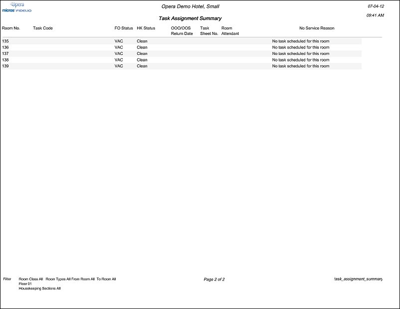 Available when the Rooms Management>Facility Management or Rooms Management>Task Assignment application functions are active and an Auto Generation of tasks has been generated, the Task Assignment Summary report displays every room in the property along with the Housekeeper assigned to take care of it. This makes it easier to communicate and manage the Task Assignments and helps in the inspection process, should it be necessary.