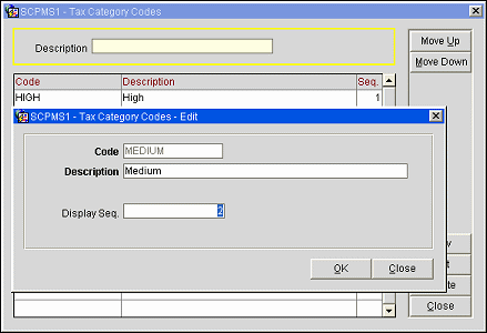 Display Seq. Enter a number that will determine the position of the tax category code when it is displayed in lists of tax categories. Tax categories that do not have a sequence number assigned are displayed in alphabetical order following those codes that have a sequence number.