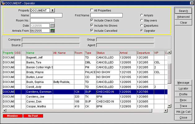 Select Miscellaneous>Show Quick Keys>Operator (Ctrl+F7) or press Ctrl+F7 from any area in the OPERA application to display the Operator screen. By default, this screen shows all reservations (in-house, due in, due out, checked out, no shows, and cancelled) having a stay date (or proposed stay date) anytime in the period 3 days before through 7 days after the current business date (shown in the Date field). In addition, reservations must have an arrival date within the last 6 months. The earliest covered arrival date is shown in the Arrivals From field, which may be edited.