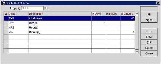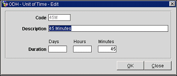 Units of time are needed to create task times and response times. When you are finished creating, editing, or deleting codes, press the Close button to exit.