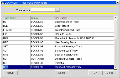 Select Trace Group. Pick the Trace Group for the Trace Code you wish to see. Trace Groups are higher-level categories of Trace Codes.