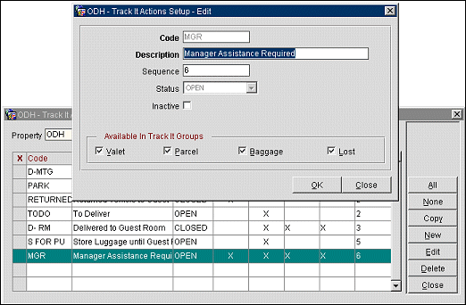 Track It actions identify what response is expected from staff or other parties relative to a Track It ticket. For Parcel or Baggage tickets, actions might be Store, Deliver to Room, Deliver to Conference, etc. For Lost types, actions might be Hold for Guest or Deliver to Room. For Valet tickets, actions might include Park, Retrieve, Refuel, Wash, etc. Actions are associated with a status that indicates whether some response is pending or expected of staff (an Open status), or whether no action is required or the ticket is resolved (a Closed status). Action statuses are used by OPERA to filter tickets for display and query purposes.