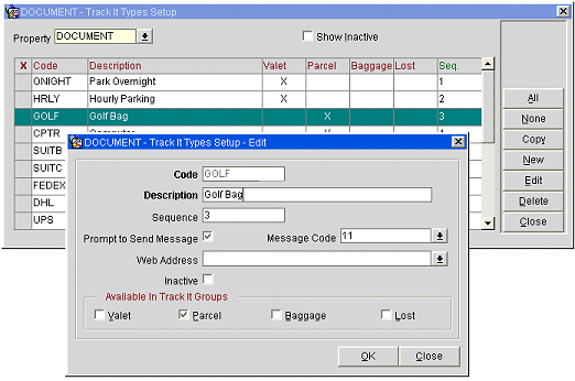 You may configure an unlimited number of types for each Track It group (i.e., Parcel, Baggage, Valet, Lost).