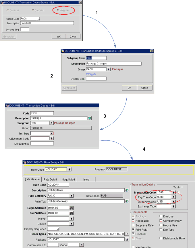 See diagram below. (1) Wrapper codes are set up under Configuration>Cashiering>Codes>Groups. (2) Subgroups are then associated with the wrapper group (Configuration>Cashiering>Codes>Subgroups) and, (3) the subgroups are in turn attached to transaction codes. These transaction codes are known as wrapper transaction codes or package transaction codes. (4) Finally, the wrapper transaction code is associated with a rate code in rate code setup (Rate Management>Rate Classifications>Rate Codes).  When charges are attributed to any of the package elements included in that rate, those charges are linked to the wrapper transaction code.