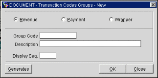 Select the Generates button to designate add-on charges for a transaction code group.