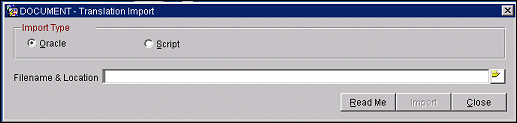 Select the Read Me button for additional information about this utility. To run the translation import utility, provide the following information and select the Import button.
