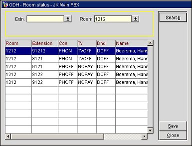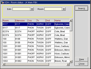 The grid is interactive and displays the status of the available features for the selected interface. Certain columns in the grid are absolute and cannot be modified (such as the room and extension). In other columns, users can modify the status of a specific feature. As an example, a telephone system interface may be used to turn the message light on or off in a guest room, to enable or disable the phone in guest rooms, and to view the status of the phone system.
