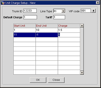 Note: When editing existing unit charges, charges with an identical trunk ID/line type/VIP code/tariff combinations are grouped together.