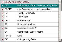 X. Select this check box to add this room type to the Room Translation when Import is clicked on. By default, any room type that has the Send to Interface check box selected on the Room Types screen will be marked with an X in the grid. Selecting a room type in the grid and importing it will select the Send to Interface check box on the Room Types screen.