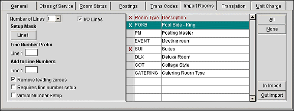 In Import. When the I/O Lines check box is checked, select the In Import button to import the room types that have been configured with an In Line. When a posting is sent from IFC
