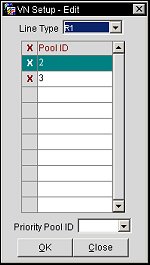 Select the line type from the list of values in the Line Type field and then select the pool ID(s) associated with the line type selected, and then select the OK button. Select the Priority Pool ID from the drop-down list that when set, will send only the number from the priority pool per line type. When 2 or more Pool IDs set up for one Line Type, one Pool ID can be configured for the Priority Pool ID. For example, have pools 2 and 3 set to Line Type R1. Edited it to add Priority Pool ID of 3 and saved. This will cause pool 3 virtual number to be the only number that goes to the IFC when it is assigned with any others for this line type.