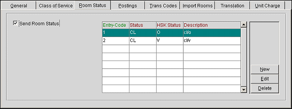 Send Room Status. Selecting this check box will send Checked In, Check Out, Out of Order, Out of Service, Clean, Dirty, Inspected, and Pickup (Entry-Code set up in the grid) to the Interface any time the room status is changed in OPERA. The Interface sends the message to the external system with the updated status of the room. This room status could then be reflected, for example, on a display floor panel for each floor as a reference for housekeeping attendants.