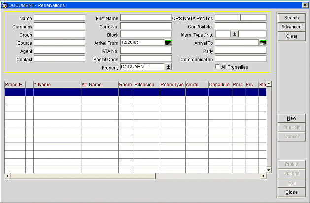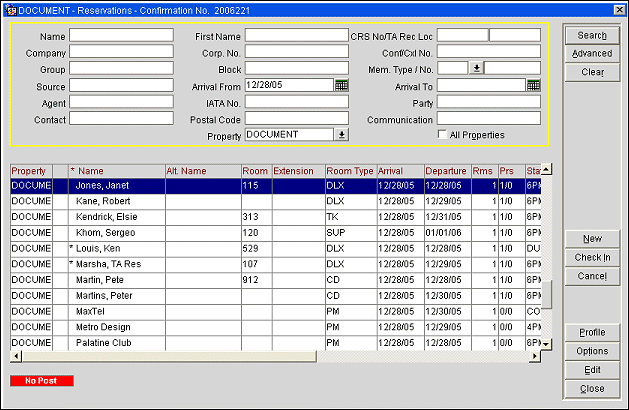 Use this screen to search for the reservation you wish to review or update. This screen has a wide variety of search criteria for you to use in locating the reservations you are interested in. (Searching on the guest's confirmation number, if it is handy, is the often the fastest way to locate a specific reservation.) When you select Search, a list of reservations that match your search criteria is displayed in the Reservations search results grid.