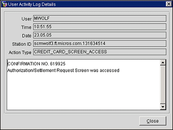 Note: If the GENERAL > MASK CREDIT CARD NUMBER application function is set to Y and the user has Credit Card Information View permission, the user activity log records each time such user accesses an Opera screen that displays credit card information (i.e., credit card numbers and expiration dates) — which in these cases will be un-masked — regardless of whether any action was taken on the credit card information itself. These screens include the Reservation screen, the Payment screen, the Profile screen, the Group Rooming List, and others. Following is an example of the activity log details in this situation: