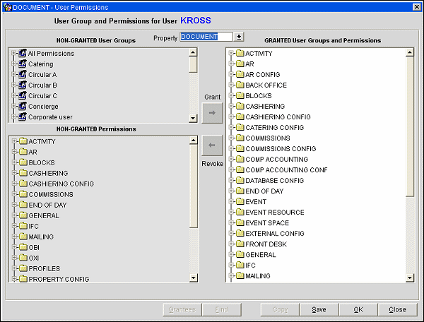 One key advantage of configuring permissions for multiple properties in this manner is that is allows a user to utilize the same login credentials across several properties, and if need be, at varying degrees of access for each Hotel. For instance, if user KROSS has a need to access catering configurations items for OPERA in HOTEL1, but no need for the same in HOTEL5, the access can be GRANTED for HOTEL1 and remain NON-GRANTED for HOTEL5.