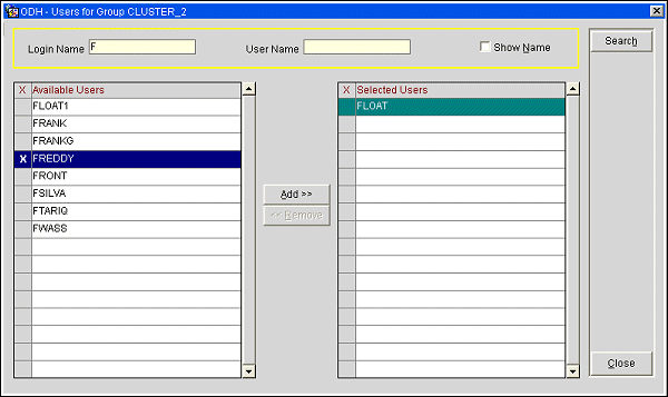 To add users to the current group (shown in the title bar) click in the X column next to the user name in the Available Users portion of the screen. Select the Add button to move the user name to the Selected Users portion of the screen.