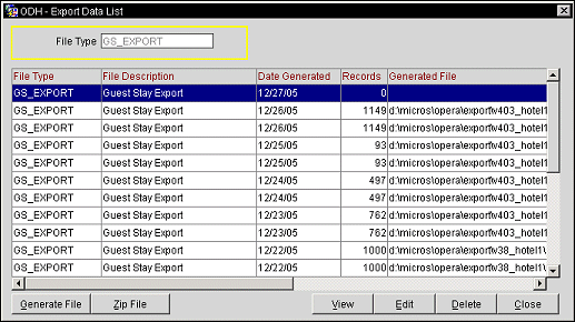 View. Select the View button from the Export File List screen to display the Export Data List screen. Here you can manually generate an export file, delete, view, or edit a file.
