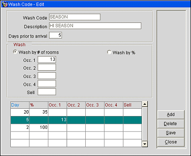 Note: Only one wash code (either By Value or By Percentage) can be configured for each day prior to arrival, per property.