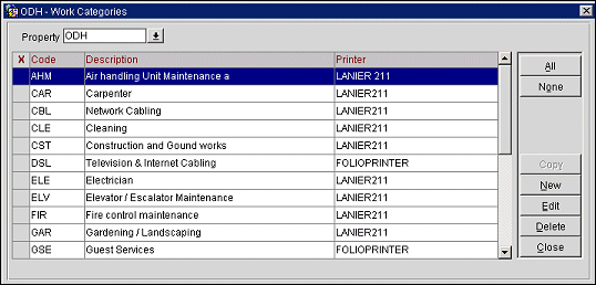 X. Selects a work category to be copied to another property, edited, or deleted. To select all of the work categories, use the All button and unselect the categories with the None button.