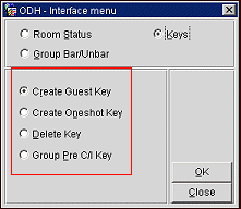 The Keys radio button allows users to create new or duplicate keys, delete keys, or read keys used for third-party key card and card lock systems. When the Keys radio button is selected, four additional radio buttons appear on the Interface Menu, as shown in the image below: