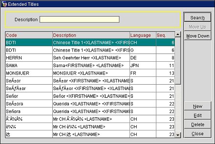 Select Configuration>Profiles>Titles>Extended Title to create or edit codes for alternate titles that use double byte languages. The Extended Titles screen displays. The titles entered here appear in the LOV of alternate titles, for users' selection, on the guest Profile Screen when the Alternate Name globe icon is selected (see Alternate Name for more information). By selecting alternate names and titles, guests from other countries can be identified according to their native custom. For example, if your guest is Japanese and staying at a hotel in New York City, USA, you may want to verbally greet and acknowledge the guest in writing using their originating language, title, and name (i.e. Mr. Suzuki can be identified as Suzuki-Sama. The guest's name and title can also be displayed and written using double-byte Kanji characters, if configured in Character Conversion.)
