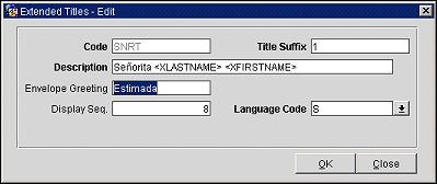 Note: When Global>Profiles>Parameters>Advanced Title = Y, the Title Suffix functionality will be available, and the “Title Suffix” field will be displayed on the Titles-New/Edit screen. With Title Suffix, by assigning a different suffix number, a user can configure many different salutations and envelope greetings for the same Title Code. When Global>Profiles>Parameters>Advanced Title = N, the “Title Suffix” field will not display and the Advanced Title functionality is not available. However, with the Advanced Title application parameter set to N, a user can still create different titles using the same title code. The difference is that with Advanced Title parameter set to Y, a Title Suffix is required when creating titles with the same title code. See the tables under Advanced Title section for examples on how this works.