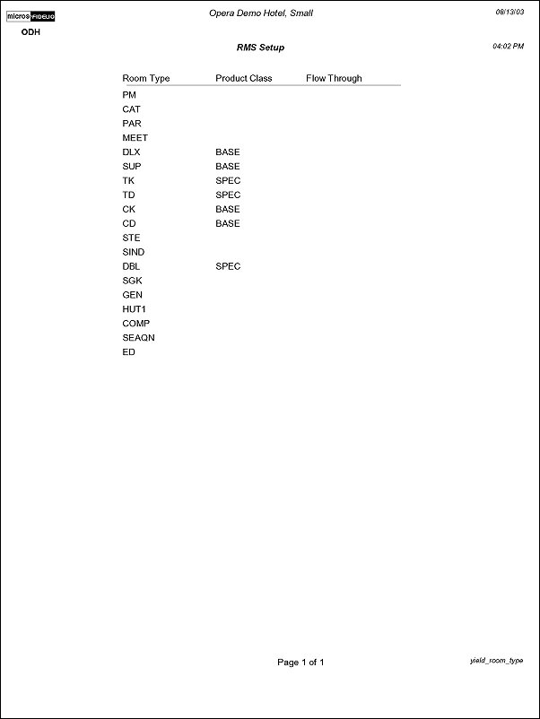 The Yield Setup (Rooms) Report displays Room Type, Product Class (SPEC, BASE), and Flow Through statistics. This report can be used to determine what product class is assigned to each room type in Opera PMS as well as indicating to you which room type is their Flow Through room type.